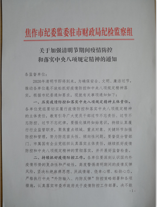 焦作市紀(jì)委監(jiān)委駐市財(cái)政局紀(jì)檢監(jiān)察組關(guān)于加強(qiáng)清明節(jié)期間疫情防控和落實(shí)中央八項(xiàng)規(guī)定精神的通知