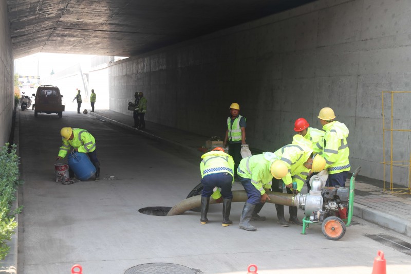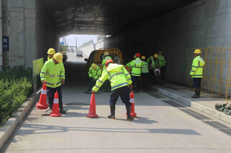 演練現(xiàn)場模擬特大降雨后,東海大道U型槽段周邊停電導(dǎo)致待焦鐵路立交雨水泵站無法正常使用,路面出現(xiàn)嚴(yán)重積水,最深處達(dá)到30cm,影響行車安全,車輛無法通行。面對突發(fā)險(xiǎn)情,市投資集團(tuán)防汛指揮部迅速啟動(dòng)應(yīng)急預(yù)案,在U型槽路面最低處慢車道積水最低處雨水檢查井設(shè)置抽水泵,同時(shí)布置水帶繞過U型槽東側(cè)外墻至高位雨水檢查井,通過高位雨水管道將積水排放至山門河。